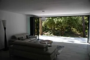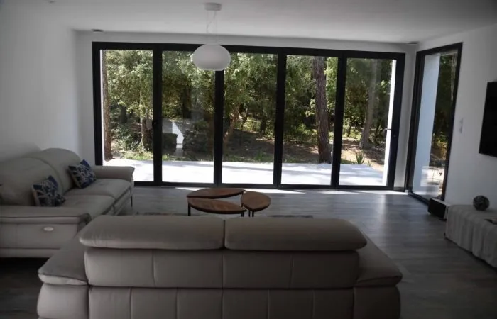 Une baie accordéon créée avec une ouverture panoramique sur la forêt.
